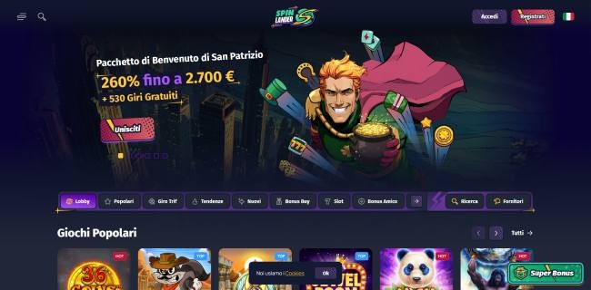 Il bonus di benvenuto del 260% fino a 3.000€ + 530 giri gratis è competitivo, ma il vero punto di forza di Spin Lander è la velocità: prelievi elaborati in 12-24 ore, molto più rapidi della media del settore.