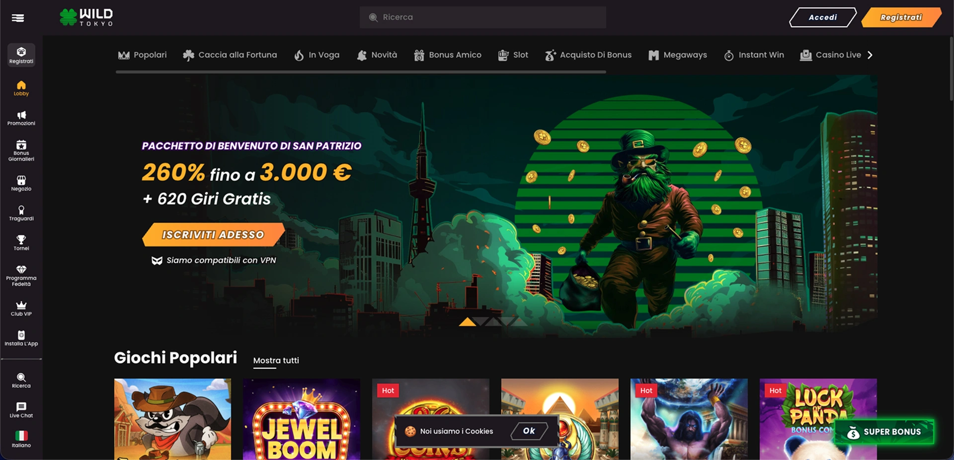 Il pacchetto di benvenuto del 260% fino a 3.000€ + 620 giri gratis posiziona Wild Tokyo ai vertici del mercato. Con oltre 4.000 giochi disponibili, incluse le slot più popolari e un’ampia sezione di casinò live, questo casinò online sicuro soddisfa le esigenze di ogni tipo di giocatore.